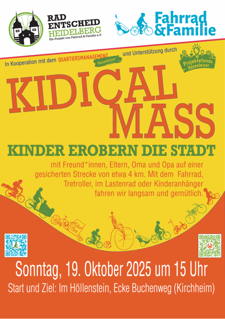- Organisiert wird die Heidelberger Kidical Mass von Fahrrad und Familie e.V. und dem Radentscheid Heidelberg in Kooperation mit dem Quartiersmanagement Hasenleiser.