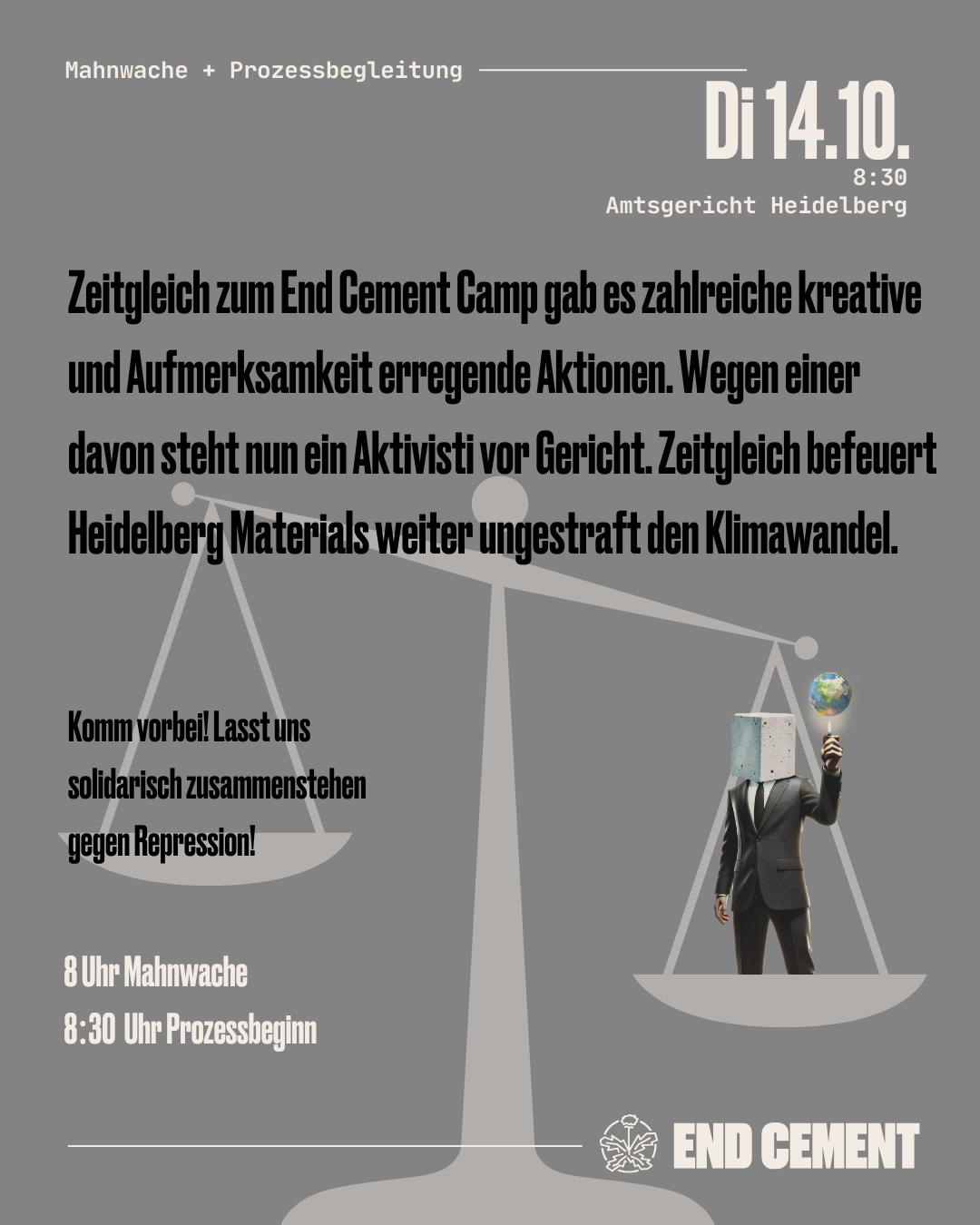 Sei dabei und hilf auf die Ungerechtigkeit aufmerksam zu machen! Denn Unternehmen wie Heidelberg Materials zerstören weiter unsere Umwelt und unsere Lebensgrundlage. Für Ihren Profit und wir müssen die Schäden dann bezahlen und ausbaden. Mahnwache ab 8 Uhr vor dem Amtsgericht Heidelberg und anschließend ab 8:30 der Prozess im Gericht.