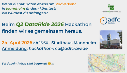 Am 24. April 2026 ab 15:30 Uhr arbeiten wir im Stadthaus Mannheim bei einem Hackathon gemeinsam daran, den Radverkehr mit Daten sicherer zu machen. Die Plätze sind begrenzt. Anmeldung ist erforderlich: hackathon-ma (at) adfc-bw.de